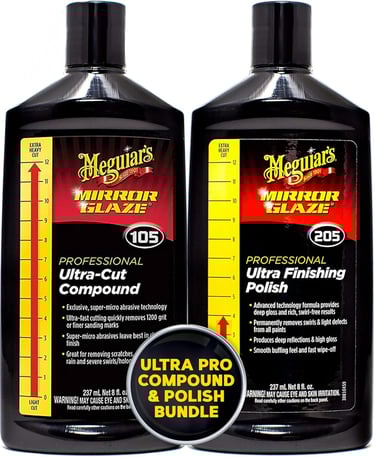 Compound and polish kit, includes M105 Ultra-Cut Compound & M205 Ultra-Finishing Polish, professional-grade, removes scratches and swirls, enhances gloss, ideal for detailing.